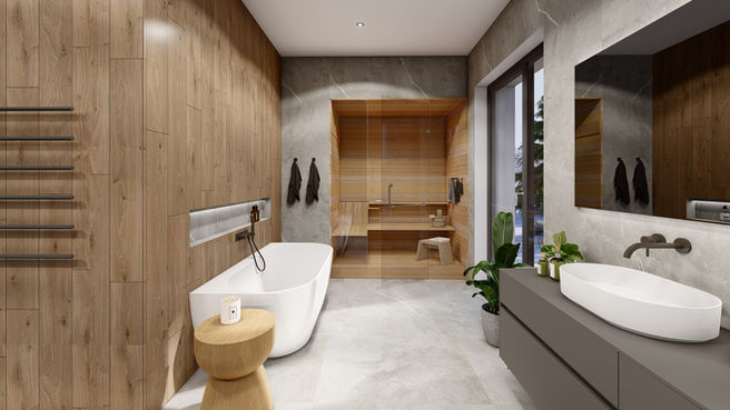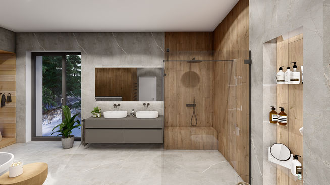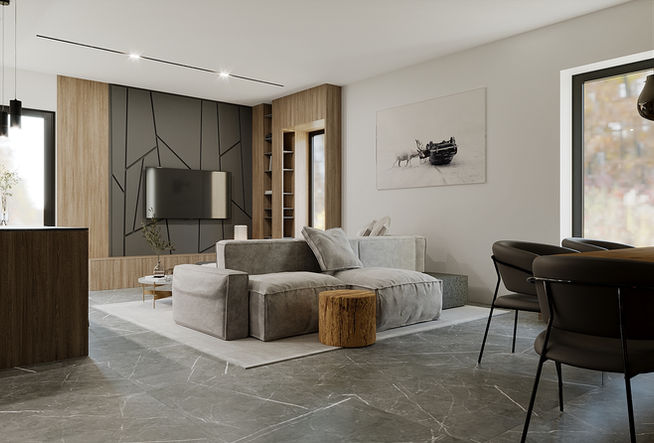 Návrh interiéru pro milovníky horských interiérů, dÅ™eva, kamene, a tmavších barev. Pocit, jako když jste na dovolené v moderním alpském chaletu si pÅ™áli majitelé domu ve Zdibech pÅ™enést i k nim domů. Velký důraz byl kladen na prostornou koupelnu, která byla pojata jako soukromé wellness se saunou, vanou s výhledem z okna, sprchovým koutem pro dva a dvojumyvadlem s velkým zrcadlem. V obytném prostoru nechybí krb na dÅ™evo pro dotvoÅ™ení pÅ™íjemné atmosféry. Zajímavým prvkem je televizní stÄ›na, jež volnÄ› pÅ™echází v sedací okno, které má v sobÄ› ukrytou knihovnu.